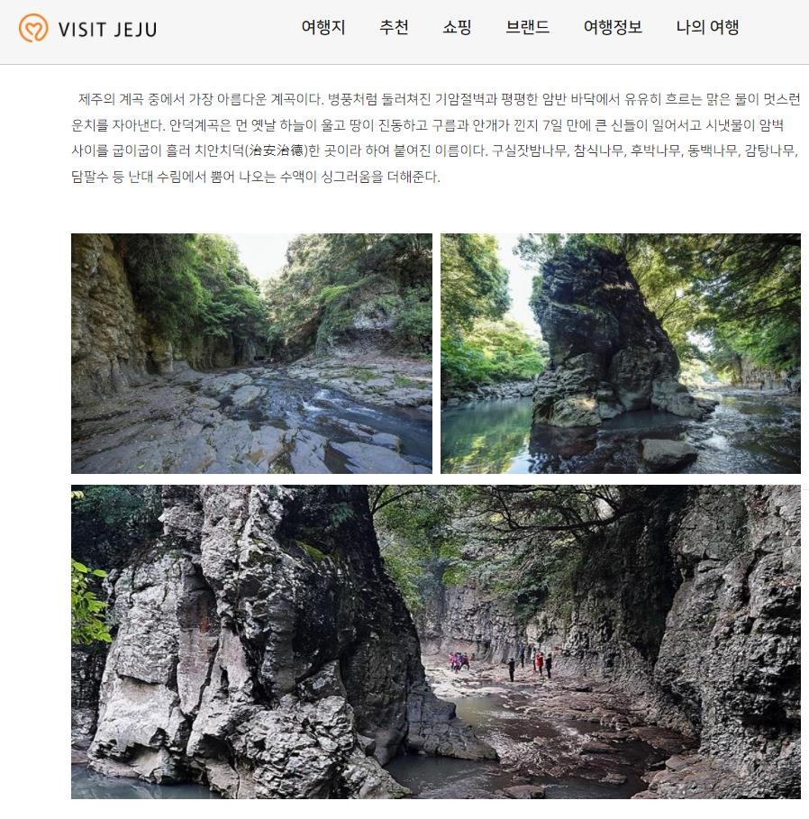제주관광공사 홈페이지에 들어가서 안덕계곡을 찾아보면 첫 문장을 다음과 같이 소개하고 있다.