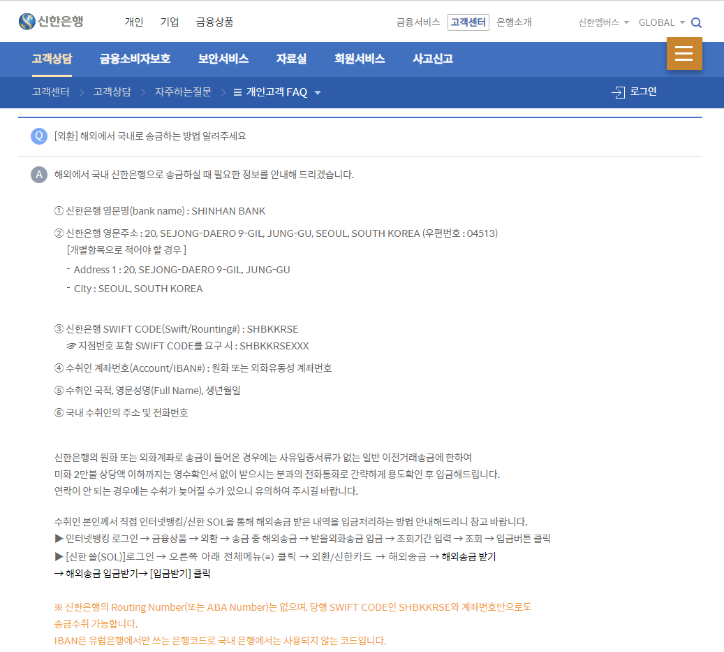 (출처 : 신한은행 개인고객 FAQ)