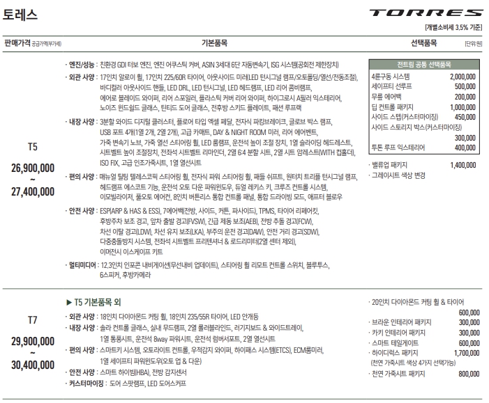 토레스의 가격표와 옵션표도 함께 첨부해 두었다.
