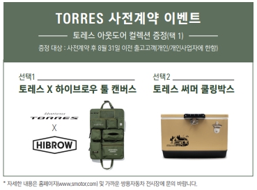 사전계약 후 8월 31일 이전 출고 고객에게는 토레스 아웃도어 컬렉션을 받을 수 있는 혜택도 주어진다.