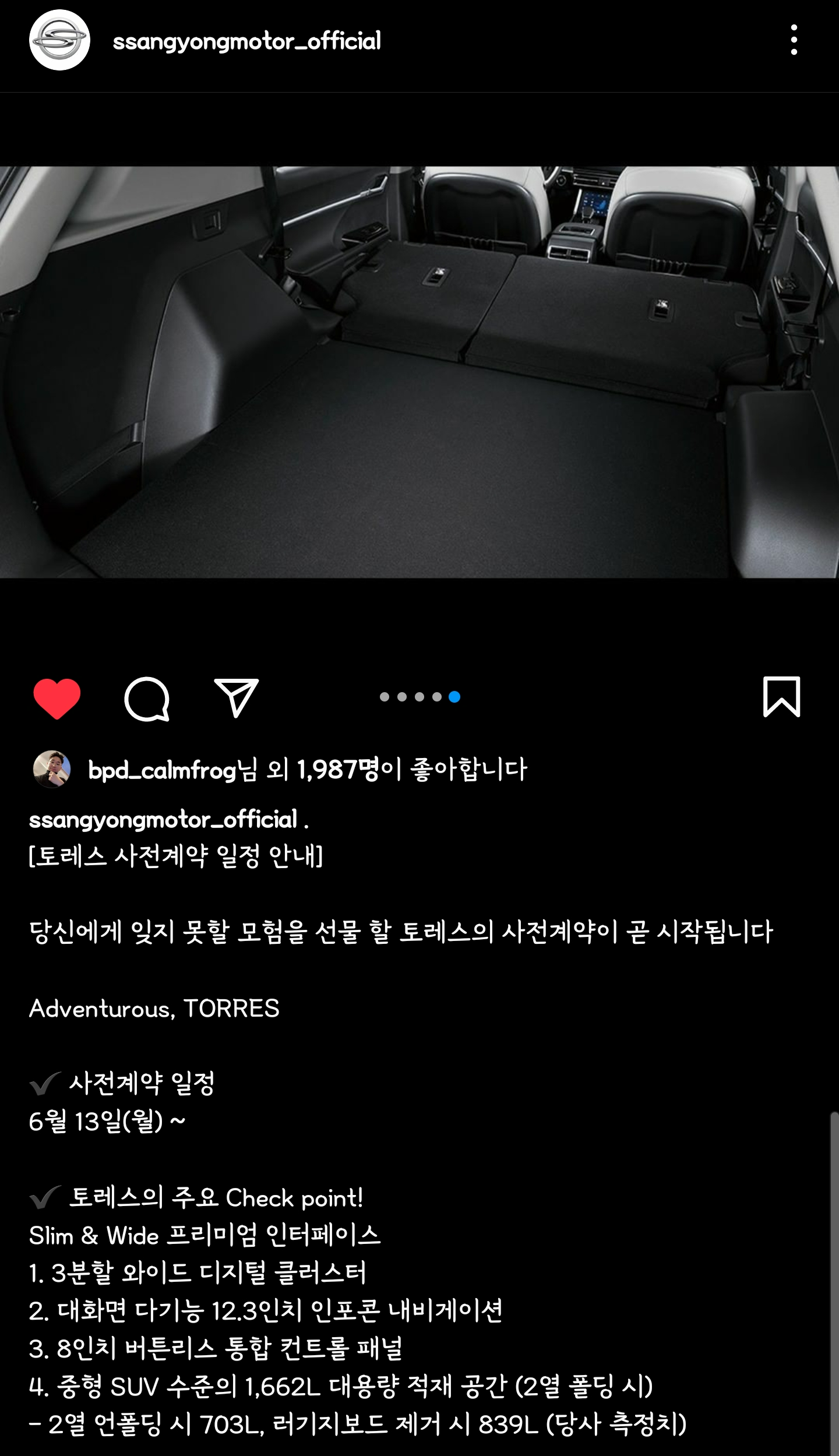 쌍용자동차 인스타그램 링크로 들어가시면 토레스의 더 많은 사진을 볼 수 있답니다. ^^