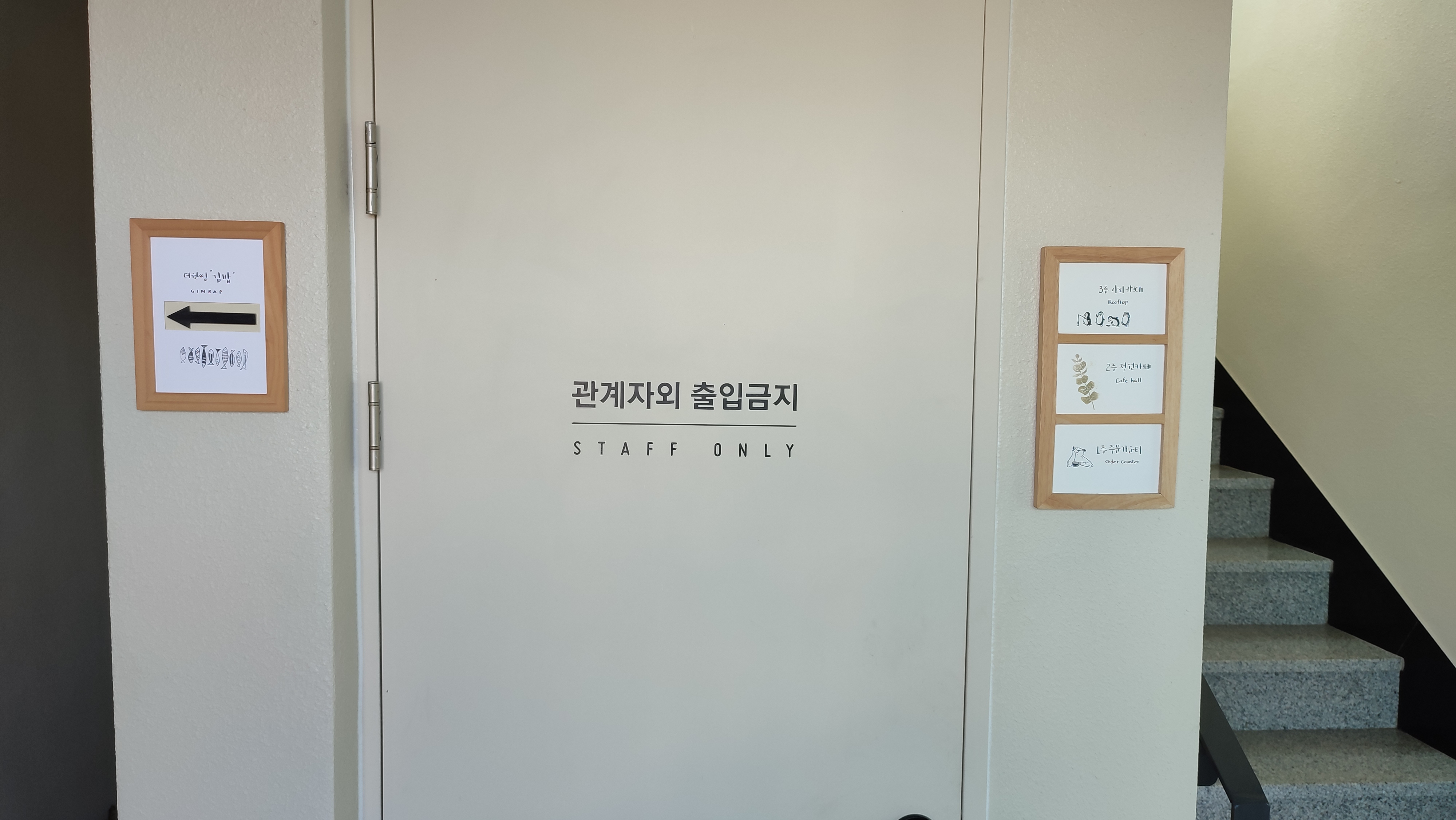 입구에서 오른쪽은 카페 더윈썸, 왼쪽은 김밥과 고기국수를 판매하는 식당이다.